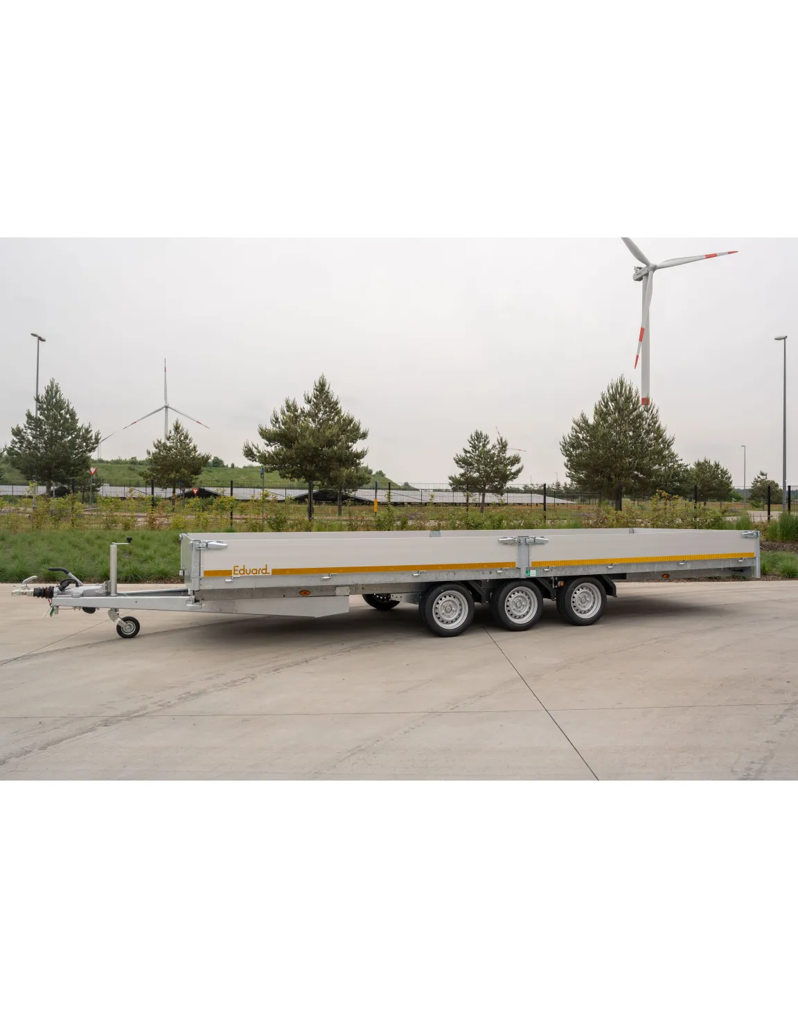 Dank der soliden Konstruktion eines Dreiachsanhänger mit Bremsen profitieren Sie von optimaler Stabilität und Sicherheit bei jedem Transport. Dieses Modell ist bis zu einer Länge von 6 Metern erhältlich und kann eine Last von bis zu 3.500 kg tragen. Dieser Anhängertyp ist daher die ideale Basis für einen Autotransporter oder Maschinentransporter. Die hohe Tragfähigkeit und die große Ladefläche machen den gebremsten dreiachsigen Plattformanhänger zu einem multifunktionalen und zuverlässigen Anhänger für die unterschiedlichsten Einsatzzwecke.